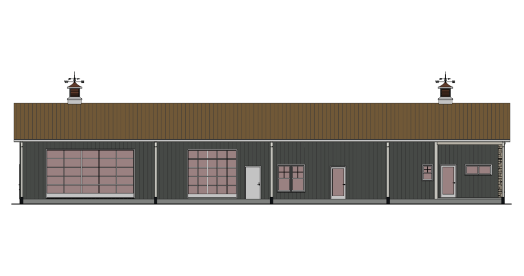 The Front Elevation illustrates the front main entry of the buildings, the two large auto garages, and the drive through garage door into the shop space.